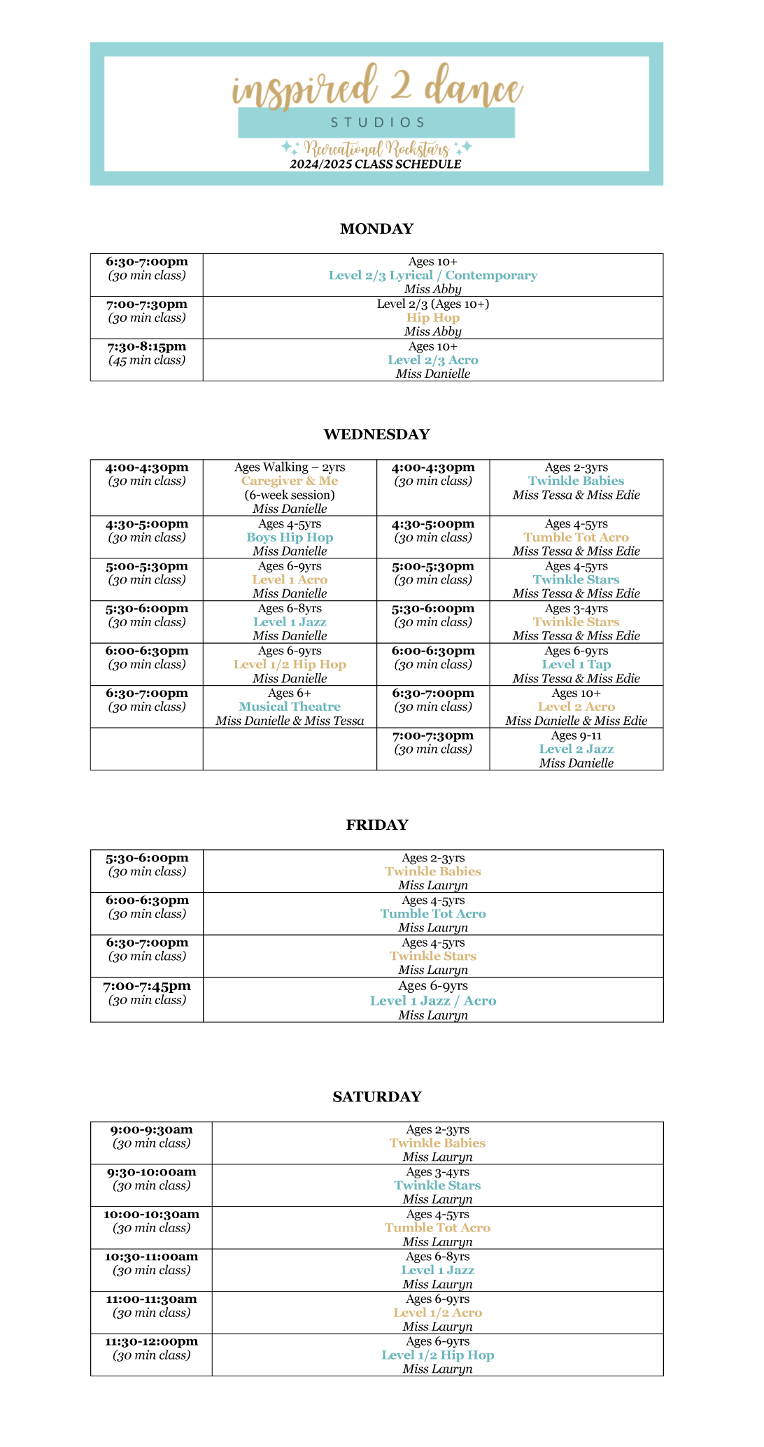 2024 / 2025 Class Schedule
